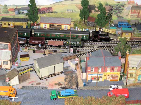 The view on this page shows most of the layout. There is also a fiddle yard ‘off-screen’ to the right. The station buildings are a ready-made Hornby item and a kit by Bilteezi. Proprietary buildings on the layout have been modified for H0, but only when necessary. This is a ‘working heritage’ railway, as there is a mix of old-style trains with very modern road vehicles. Traction for the mixed freight service is provided by a four-wheel industrial diesel, and the steam passenger service is provided by a Pug pulling two Bulleid coaches. A popular row of houses from the card range made by Superquick has been put to good use on Grangeburn’s high street. Chris’s extensive use of backdrops gives depth and completeness to the layout. The two shops are a Hornby model: the name boards and window displays make the shops look truly in use. Other shops on the layout are scratch-built, with some Bilteezi parts used. The main dairy building on the left is from a Bilteezi kit. Grangeburn retains its traditional coal operation: the main building is a Wills kit. Track is by Peco, and the layout is an implementation of the classic Inglenook pattern.